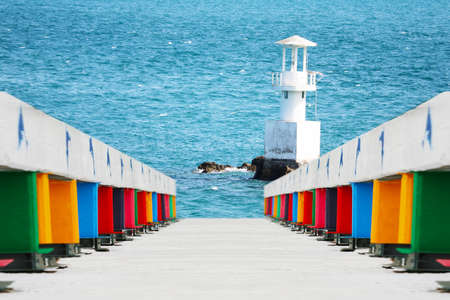 Rainbow Bridge and Lighthouse on the coast and blue sea