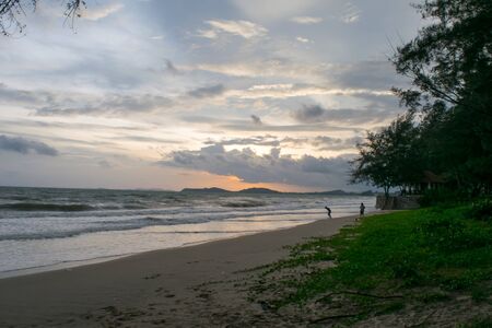Sunset at sea with trees sway at Chaolao Tosang Beach Chanthaburi Thailand for nature background or texture.