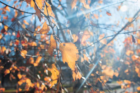 Autumn yellow dry leaves hang on birch branches, illuminated by the bright autumn sun. October. Leaf fall. Birch in autumn