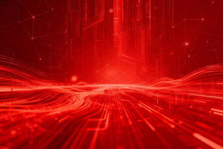 This visually striking image captures the essence of motion and speed, featuring vibrant light trails and bokeh effects against a dark backdrop. Perfect for technology themes.