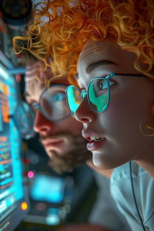 3D cartoon Caucasian woman with orange hair afro working Programmer in the office.