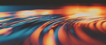 Abstract chrome metal liquid surface background. Rippling shiny texture reflecting glowing ring light. Futuristic silver fluid pattern.