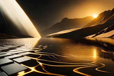 Reflection of the sun in a lake with mountains in the background, abstract wavy black and gold marble background with glowing lines.surreal environment, ai rendering.