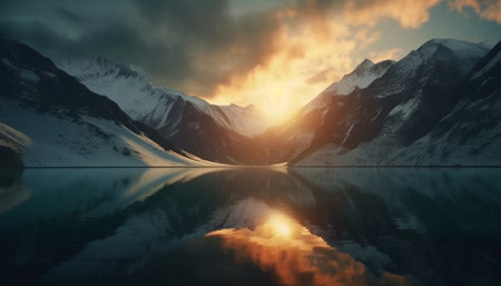 Majestic mountain range reflects tranquil sunset over snowy landscape generated by artificial intelligence