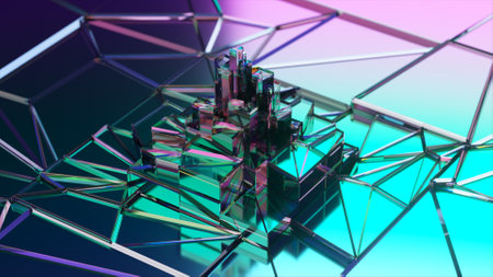 The image showcases a digitally rendered abstract design featuring a complex arrangement of iridescent metallic geometric shapes creating a visually stunning pattern.