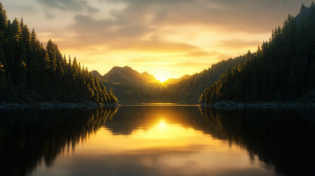 A sunset reflection on a calm lake surrounded by mountains and dense forests