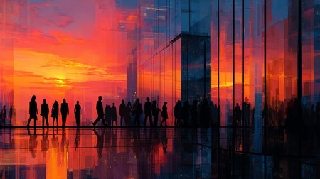 This artistic image captures a vibrant city skyline at night featuring colorful lights and reflections in water, creating a dynamic and energetic urban atmosphere.