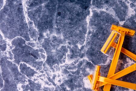 Plastic razor on blue background. The concept of using a razor. Razor device. The concept of skin care. Epilation hair removal. Orange men's shaving razors, top view.