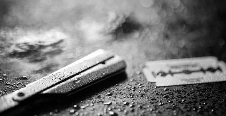 A dangerous razor and a metal blade on the table. Mens shaving