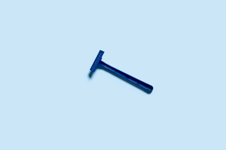 A single use shaving razor on blue background. View from above