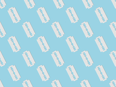 Seamless pattern of white shaving blades on a blue background. Retro tool for men's shaving.