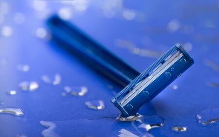 Macro view of safety razor blade on water drops background. Shave blade razor close up on blue wet surface