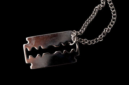 Silver decoration blade on a chain on a black background.