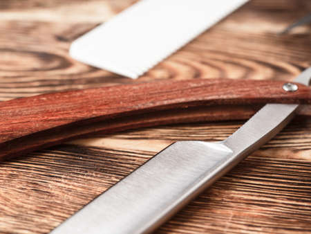 sharp open straight razor lying on a rough wooden background