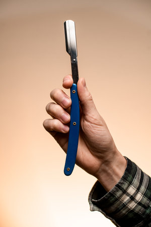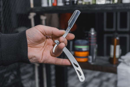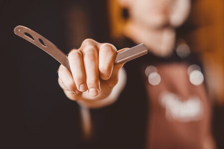 The hand of a barber or professional hairdresser holds a straight tool sharp razor equipment for shaving and beard care, close-up.