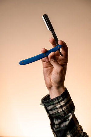Close-up of male hand masterfully holding classic old straight razor