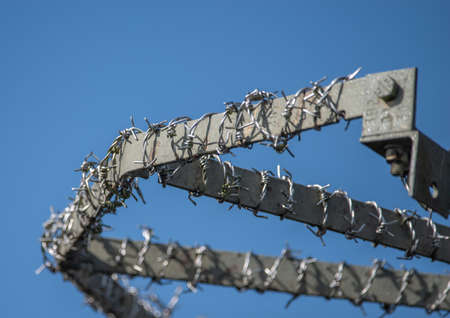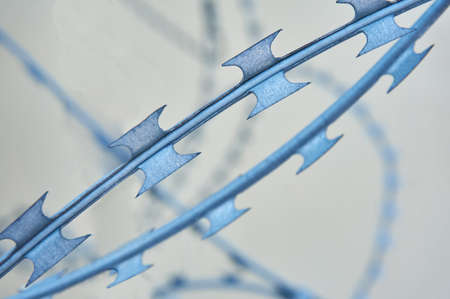 Anti-climbing device barbed wire to stop unauthorised climbing with blue background