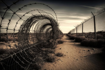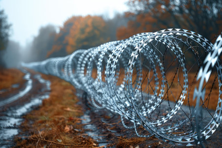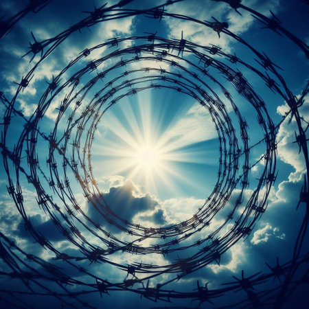 A long line of barbed wire stretches across a vast landscape, reflecting sunlight beneath a clear blue sky. This powerful image speaks to themes of security, boundaries, and protection.