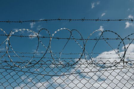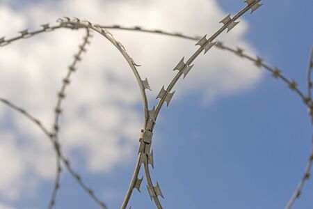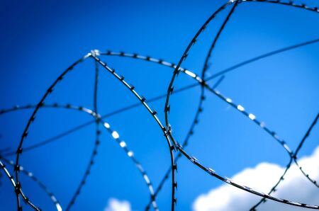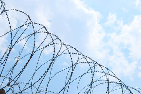 Barbed wire fence with cloudy sky background. Concept of freedom and security.
