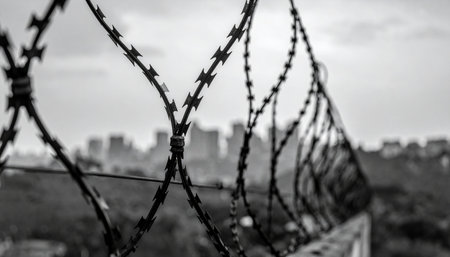 A stark, black and white close-up of a razor wire fence creates a powerful barrier. In the blurred background, a city skyline suggests a world that is both protected and confined, evoking themes of urban security, division, and the harsh lines between freedom and restriction.