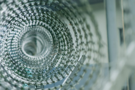 A close-up of a razor wire coil, creating an abstract geometric pattern. The intricate design of the sharp blades forms a visually striking image, perfect for use as a background. Taiwan.