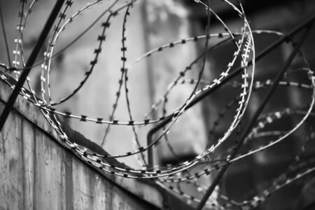 Monochrome photo of detail of barbed wire. Steel border. Prison, military or quarantine concept