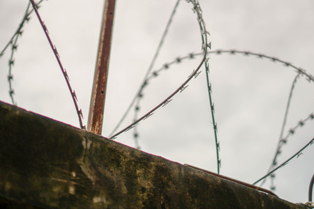 Shallow depth of field (selective focus) and filtered image with a razor wire on the outside wall of a governmental institution on a cloudy day.
