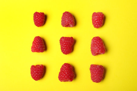 Flat lay composition with delicious ripe raspberries on yellow background