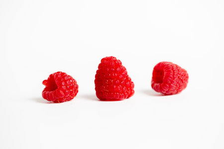 Three fresh red raspberries arranged on a soft light background, highlighting their juicy texture and vibrant color, perfect for food photography projects.