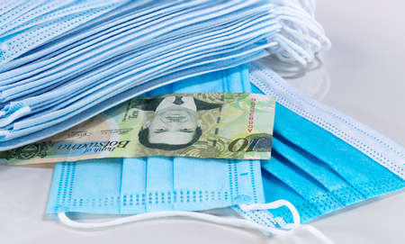 Face masks and Pula of Botswana on white background. Face mask the new world currency. Corona virus let price rising high for mouth protection. Close up on Botswana money and mouth protection