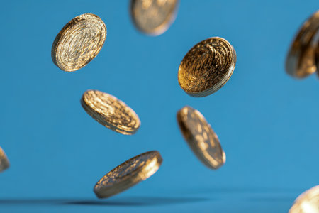 Gleaming gold coins cascade dynamically across a vibrant blue canvas, capturing vitality and prosperity in motion?ideal for themes of growth, wealth, and financial achievement