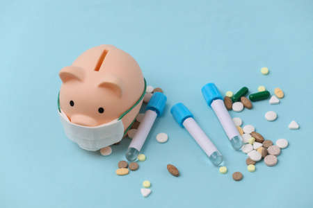 Piggy bank in medical mask, test tubes with pills on a blue background