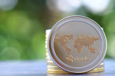 Crypto coin Ripple XRP in black background with another coins. Gold light.