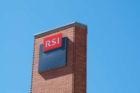 Lugano, Ticino, Switzerland - 12th September 2019 : Close up view on the RSI (Radio Svizzera Italiana) Logo against the blue sky located on the building in the Besso area in Lugano, Switzerland