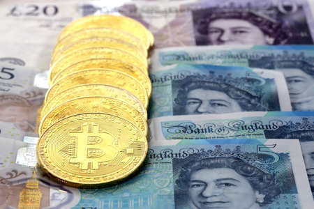 Virtual cryptocurrency money Bitcoin golden coins on United Kingdom Pound sterling banknotes with faces of Queen Elizabeth II.