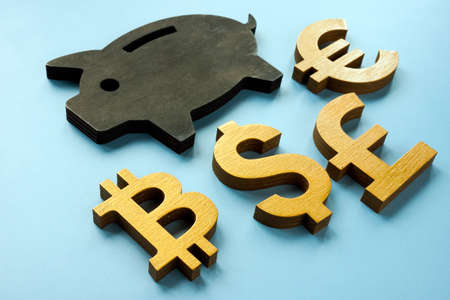 Savings portfolio of currencies concept. Bitcoin, dollar, pound and euro signs.