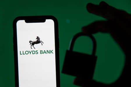 LONDON, UK - June 2020: Lloyds bank logo on a phone with a security padlock