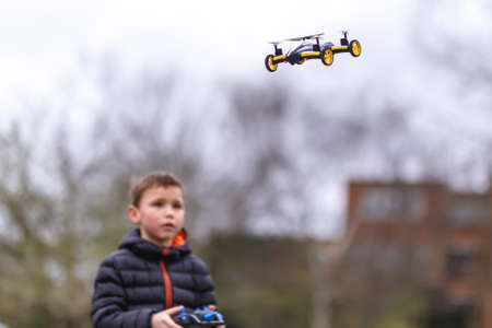 School boy with quadrocopter inthe park, London