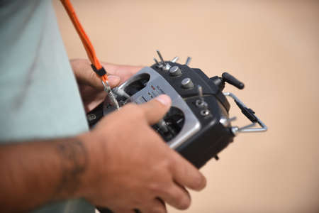 Hands of a man with a control panel for drones.