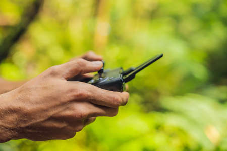 the hands of the male pilot are holding the remote control of the drone. Drone video filming.