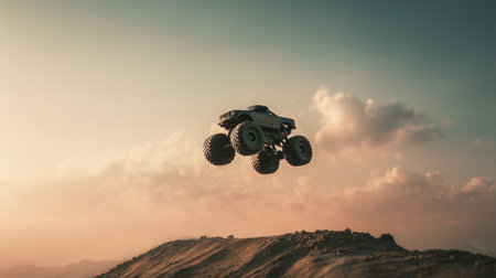 Monster truck mid-air jump over dirt mound at dusty sunset, with massive tires, flying dust, dramatic sky, and wide open off-road scene.