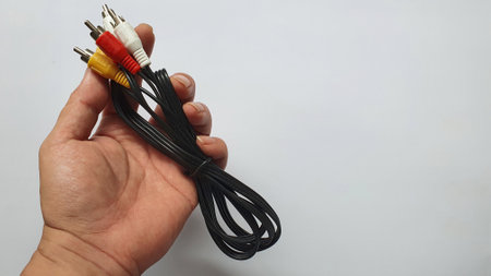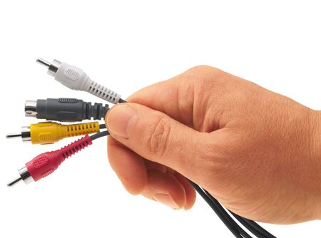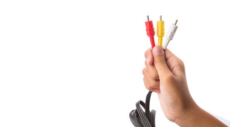 photo of a hand holding a RCA cable isolated on white