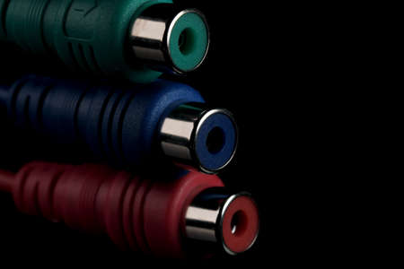 Dark blue, green, yellow, white and red RCA connectors for switching audio and video signals in modern electronic equipment