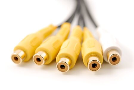 Yellow white RCA audio video plug connectors on a white background