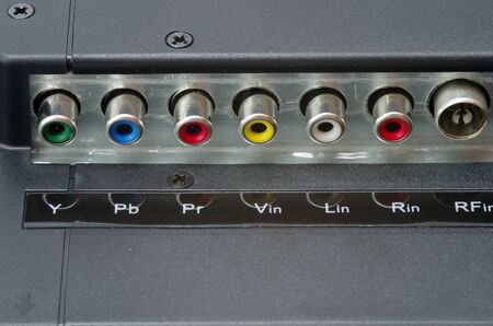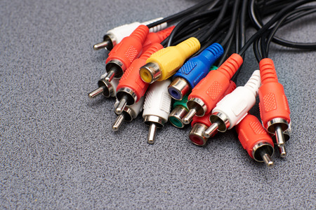 Dark blue, green, yellow and red RCA connectors for switching audio and video signals in modern electronic equipment