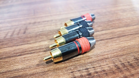 Red and white RCA plugs over wood background