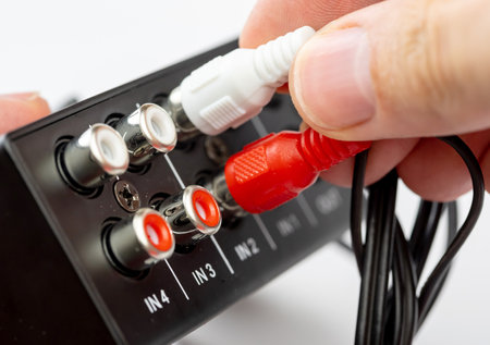 Closeup of a hand plugging in red and white RCA cables into the audio input ports on modern device, macro closeup detail view, analog connection sound mixer stereo system, connecting cables