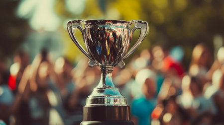 A gleaming golden trophy with a jubilant team celebrating in the background, symbolizing hard work, achievement, and recognition.