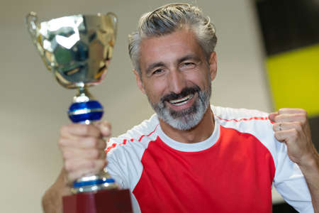 motivation of business success. trophy and prestige. got prize. guy celebrate victory.