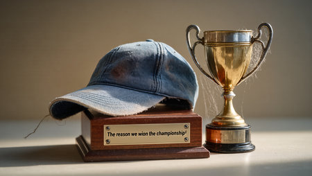 A worn cap rests beside a gleaming trophy, symbolizing hard-fought triumph.